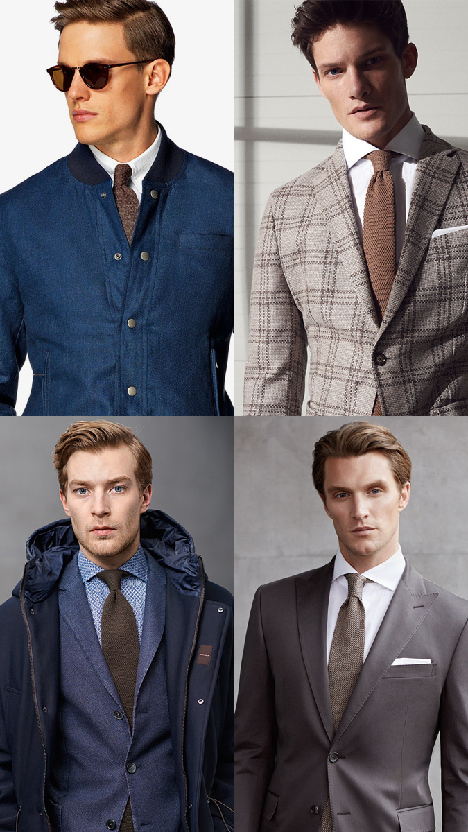 At first thought, it’s difficult to think about what may work with a brown tie, however in actuality, the choices are plentiful. Brown lends itself effectively to blue, so pairing with a navy or pale blue shirt or tailoring (or each) is at all times going to be a superb choice. For a extra winter-friendly choice, decide a knitted tie and group it with a crisp white shirt. You may then construct on the theme of texture by sporting it with a thick wool swimsuit. Incorporate a sample for bonus factors.