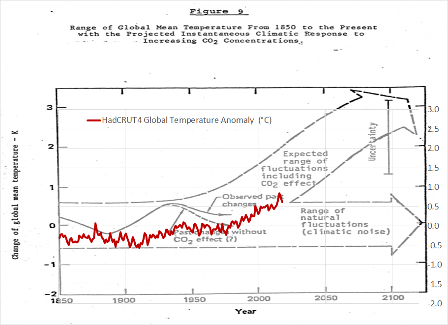 By 1982, Exxon’s “good local weather modelers” (/SARC) predicted that, other than the latest El Niño, HadCRUT4 would stay inside the “vary of pure fluctuations (climatic noise) for no less than the following 40 years.