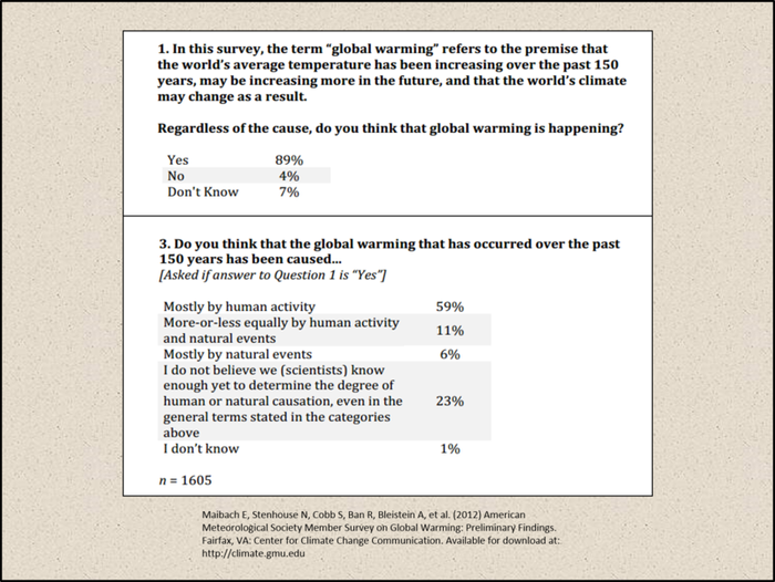 Stenhouse, N., and Coauthors, 2014: Meteorologists’ views about world warming: A survey of American Meteorological Society skilled members. Bull. Amer. Meteor. Soc., 95, 1029–1040, doi:https://doi.org/10.1175/BAMS-D-13-00091.1.