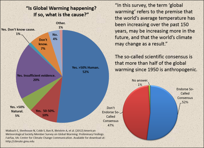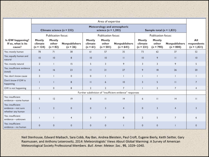 The 52% general “consensus” among the many membership of the American Meteorological Society was defined away as being because of “perceived scientific consensus,” “political ideology,” and a scarcity of “experience” amongst non-publishing meteorologists and atmospheric scientists…