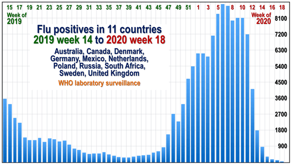 Fig. 2. Flu positives in 11 international locations: weeks 14-18 of 2019 and 2020 in contrast.