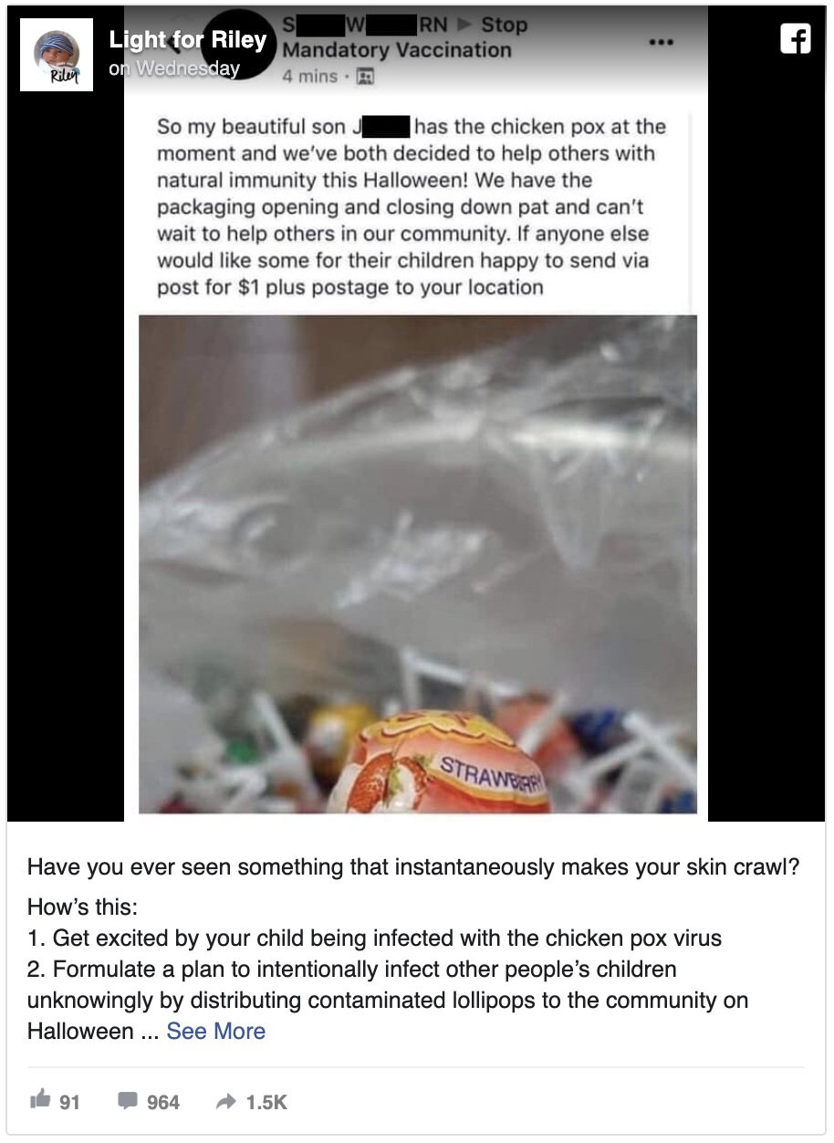 An Australian anti-vaxxer mum has reportedly mentioned she was giving trick-or-treaters rooster pox-tainted lollipops for Halloween, claiming the candies would assist give youngsters the an infection that her son has to allow them to get the rooster pox over with and be immune for all times, in response to a publish shared in a pro-vaccine group referred to as “Gentle for Riley.”
