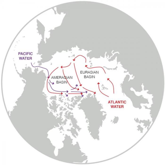 IMAGE: A MAP OF THE ARCTIC OCEAN SHOWS THE LOCATION OF THE AMERASIAN AND EURASIAN BASINS. ARROWS SHOW THE PATH OF WARM, FRESH PACIFIC WATER AND WARM, SALTY ATLANTIC WATER INTO… view extra CREDIT: GRAPHIC ADAPTED FROM POLYAKOV ET AL. 2020, FRONTIERS IN MARINE SCIENCE PAPER.