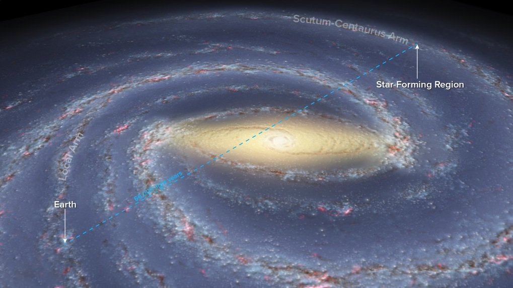 The situation of the Solar relative to Scutum-Centaurus star forming area. (Invoice Saxton, NRAO/AUI/NSF; Robert Harm, NASA.)