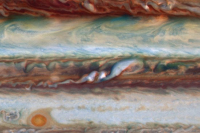 Two vivid white plumes (centre) on Jupiter, with a bigger downstream disturbance to their proper. (Imke de Pater, Robert Sault, Chris Moeckel, Michael Wong, Leigh Fletcher)