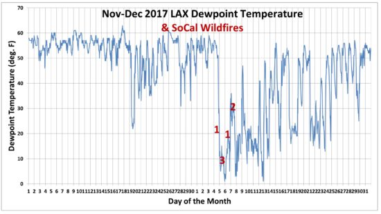 The dryness of this sinking air will be seen on this plot of the dewpoint temperature at LAX airport (Los Angeles) as dry air moved in from the east on December four with robust excessive strain positioned over Nevada, and 7 main wildfires developed and unfold from the recent, dry, and regionally windy situations.