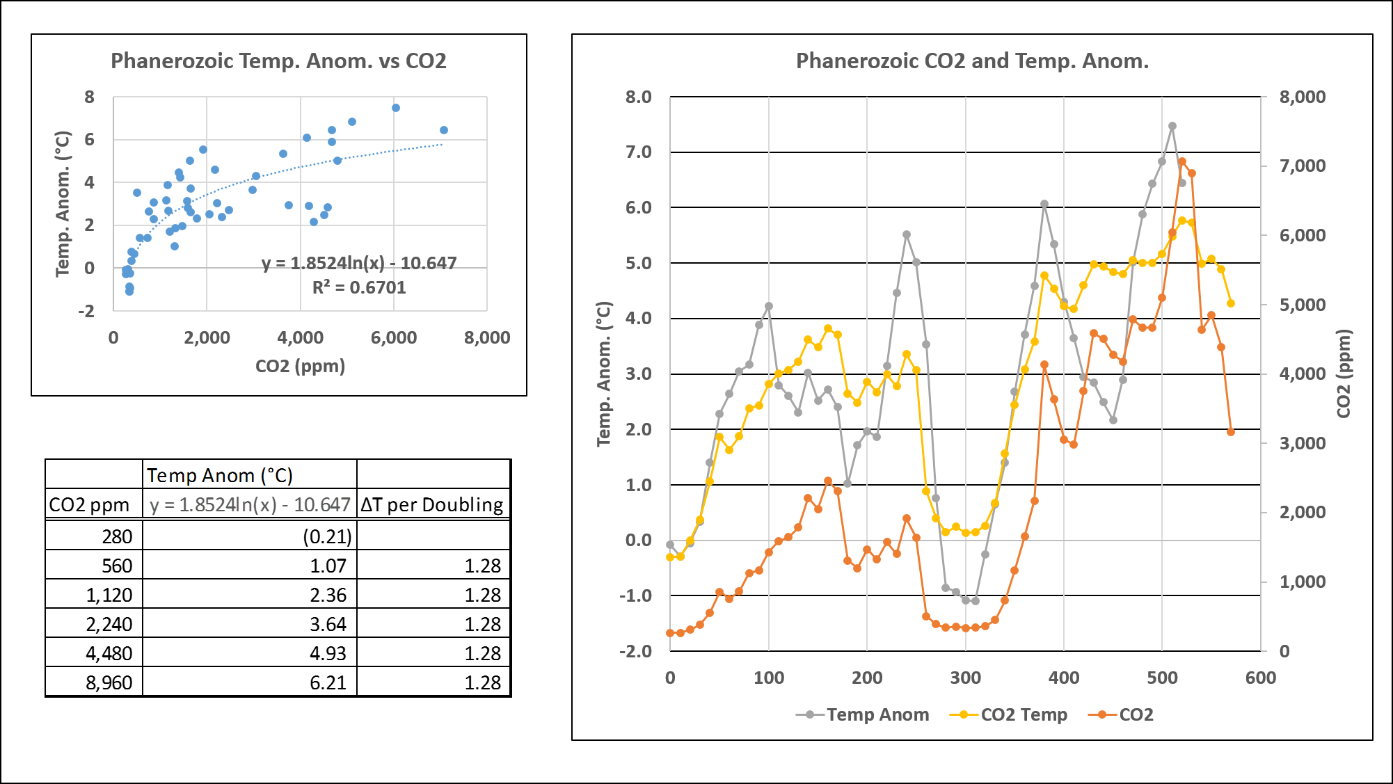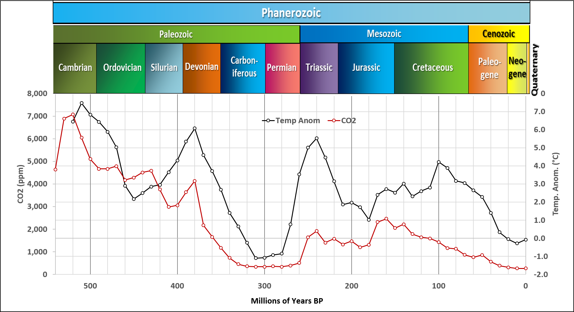 Determine 5. Phanerozoic CO2 vs temperature. Unlabeled x-axis is in hundreds of thousands of years earlier than current (older is towards the precise).