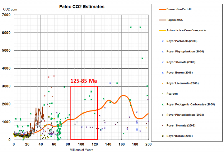 If we take a look at the mid-late Cretaceous interval, we are able to see that the volcanism–>CO2 –>warming narrative doesn’t fairly work. Even when the local weather sensitivity is 1.28 °C per doubling of CO2… CO2 was declining in the course of the 125-85 Ma “time of extreme international warming” Dr. Sorkhabi associates with extraordinarily prolific mid-late Cretaceous hydrocarbon supply rocks.