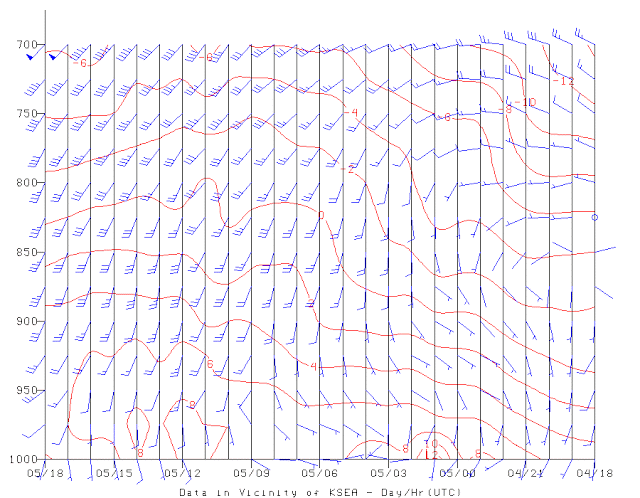 To indicate you this hen conveyor belt, listed here are the winds above SeaTac Airport for the 24 hours ending 10 AM Thursday. Time will increase to the left and the Y-axis is peak in stress (700-hPa– is round 10,000 ft). Proper after 7 PM Wednesday (05/03), the winds turned strongly southerly (from the south) and said that approach. Actually, a powerful tailwind!