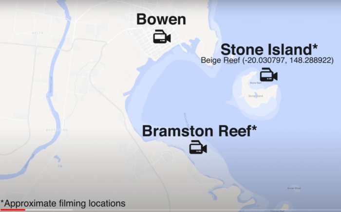 Bramston Reef is to the south of Bowen, and throughout from Stone Island. Terry Hughes has claimed there’s now solely mud flat the place there have been as soon as wholesome coral at Bramston Reef. This map options within the movie Beige Reef.