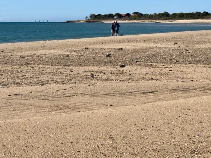 Stone Island has sand, in addition to stone, and corals in addition to mudflat. This photograph was taken on the entrance to Bowen Harbour from Stone Island in August 2019 with Rob McCulloch and Walter Starck within the distance.