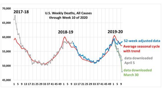 I’m seeing an rising variety of folks on social media pointing to the weekly CDC loss of life statistics which present a unusually low variety of whole deaths for this time of 12 months, when one would anticipate the quantity to be rising from COVID-19. However what most individuals don’t understand is that that is an artifact of the late arrival of loss of life certificates knowledge as gathered by the Nationwide Heart for Well being Statistics (NCHS).