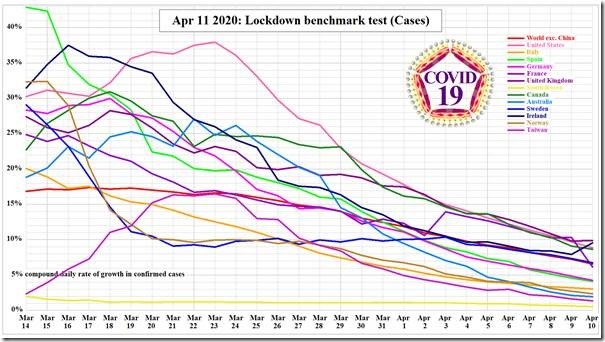 Fig. 1. Imply compound each day development charges in confirmed instances of COVID-19 an infection for the world excluding China (crimson) and for a number of particular person nations averaged over the successive seven-day durations ending on all dates from March 14 to April 10, 2020. A hyperlink to the high-definition PowerPoint slides is on the finish of this posting.