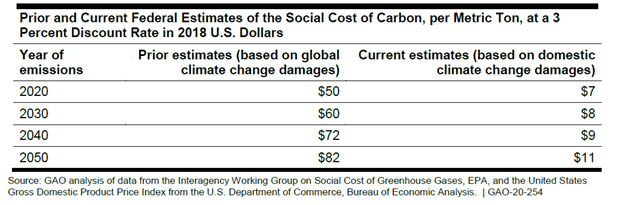 The GAO report was ready to clarify the variations between the IWG values and the interim values. It discovered “Though each the prior and present estimates have been calculated utilizing the identical financial fashions, two key assumptions used to calculate the present estimates have been modified: utilizing (1) home reasonably than world local weather change damages (see desk) and (2) totally different low cost charges (three and seven p.c reasonably than 2.5, three, and 5 p.c). Because of this, the present federal estimates, based mostly on home local weather damages, are about 7 instances decrease than the prior federal estimates that have been based mostly on world damages (when each prior and present estimates are expressed in 2018 US dollars and calculated utilizing a three p.c low cost charge).”