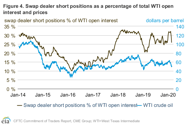 Swap seller positions: Brief positions held by swap sellers accounted for 32% of the open curiosity for the WTI futures contract as of January 21, 2020, barely lower than the all-time excessive of 33%, reached in 2018 (Determine four). Initiating a brief place, or promoting a futures contract, allows the holder to lock in a worth as we speak for the bodily supply of a commodity at some future date. Oil producers generally use swap sellers to hedge their future manufacturing. Swap seller quick positions elevated to 30% of the WTI open curiosity in mid-December, when WTI costs elevated to greater than $60/b. This worth stage, in line with a survey of U.S. exploration and manufacturing firms performed by the Federal Reserve Financial institution of Dallas, is ample to generate sufficient money circulate from operations for almost all of companies to cowl capital expenditures. The rise in swap seller quick could have elevated, partially, as a result of U.S. producers hedged a few of their anticipated 2020 manufacturing at about $60/b.