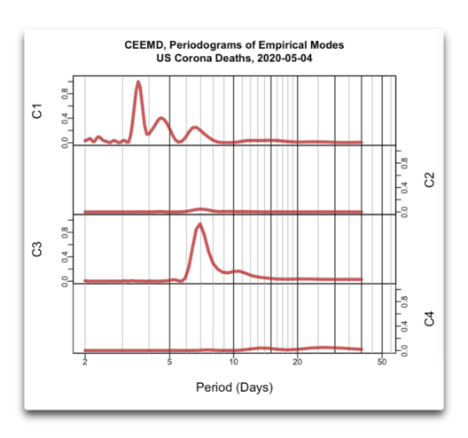 This can be a most fascinating consequence. It reveals one of many causes that I exploit the CEEMD evaluation—it breaks the uncooked knowledge down into significant underlying alerts. On this case, early within the unfold of the virus on the left-hand aspect of the graph, the 7-day sign (blue line) was fairly small. However now that there are numerous deaths the 7-day sign is far bigger. It’s this type of a consequence that’s unobtainable by say normal Fourier evaluation.