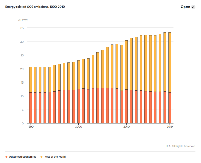 After two years of progress, world emissions have been unchanged at 33 gigatonnes in 2019 even because the world financial system expanded by 2.9%. This was primarily because of declining emissions from electrical energy era in superior economies, because of the increasing function of renewable sources (primarily wind and photo voltaic), gasoline switching from coal to pure gasoline, and better nuclear energy era. Different elements included milder climate in a number of nations, and slower financial progress in some rising markets.