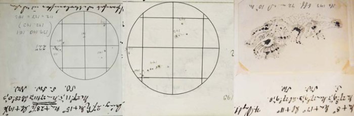 The drawing under, from a Royal Astronomical Society manuscript by German astronomer Heinrich Schwabe, exhibits the sunspots seen on 27 August (left), 1 September (center) after which a closeup of the 1 September sunspot group (proper).