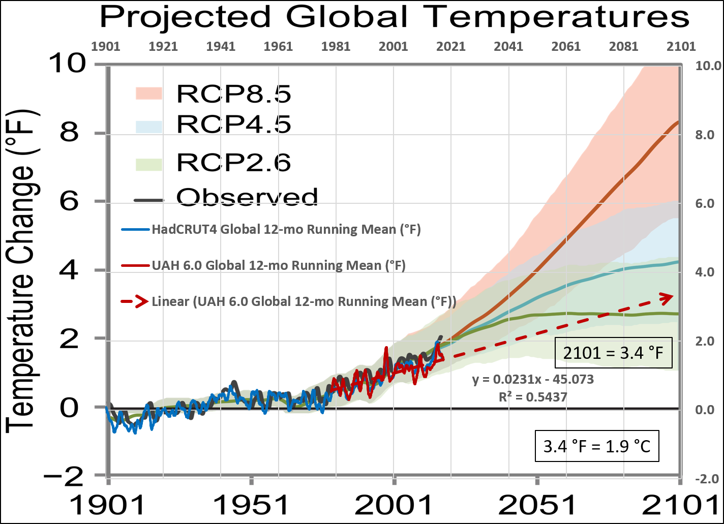 Again in November 2018, I downloaded HadCRUT4 and UAH 6.zero from our pals at Wooden For Timber. After changing to Fahrenheit and making use of static shifts to match NCA4’s baseline, I overlaid the true information on the NCA4 picture and projected UAH 6.zero to the top of this century.