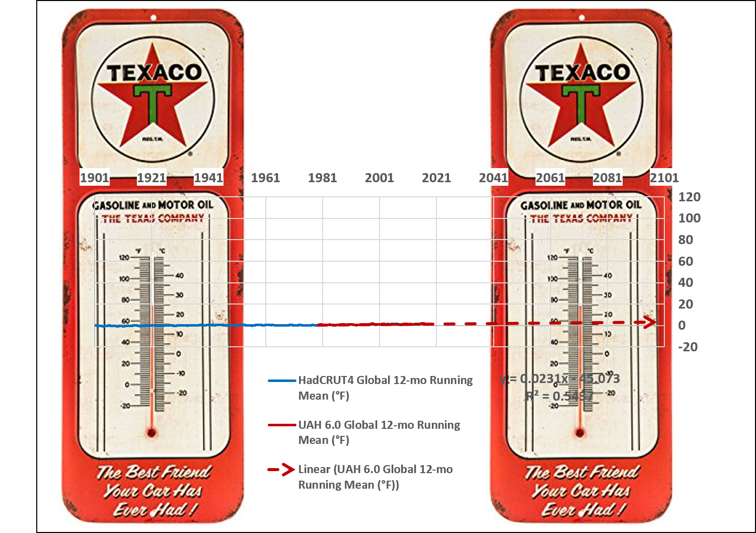 Most of us take a look at temperatures on thermometers. A thermometer on the identical scale as a typical temperature anomaly plot could be about 64′ tall. So, I took the freedom of lowering the temperature anomaly plot to the identical scale as a thermometer, a real Texaco thermometer…