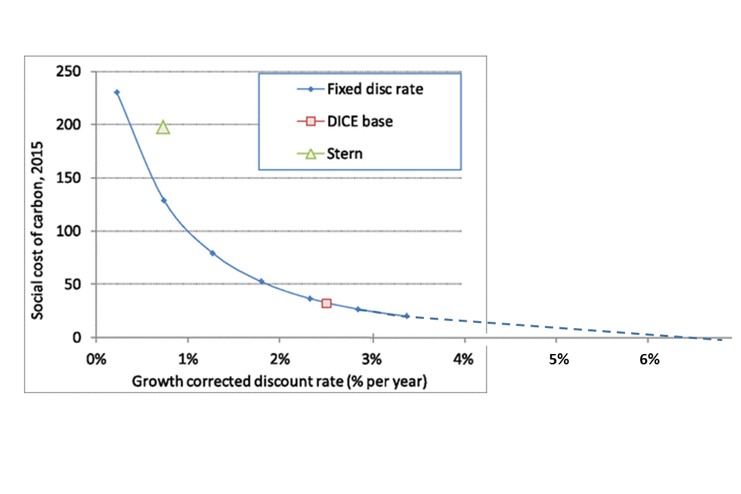 Determine 5. Determine three from Nordhaus (2017), modified by writer. A linear extrapolation of Nordhaus’ low cost price plot implies 7% low cost rated would zero-out the social value of carbon.