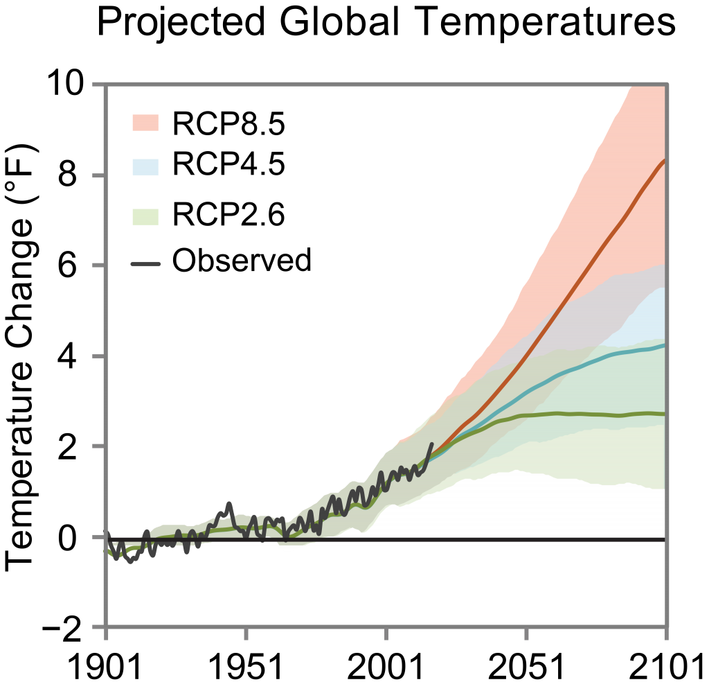 Quantity I of NCA4 (Local weather Science Particular Report) options this nifty picture of projected international temperatures (°F) for a number of Consultant Focus Pathway (RCP) eventualities. RCP2.6 is a drastic mitigation state of affairs, RCP4.5 is a powerful mitigation state of affairs, RCP8.5 is unhealthy science fiction and sometimes described as “enterprise as normal.” All of the actually unhealthy stuff occurs in an RCP8.5 world.