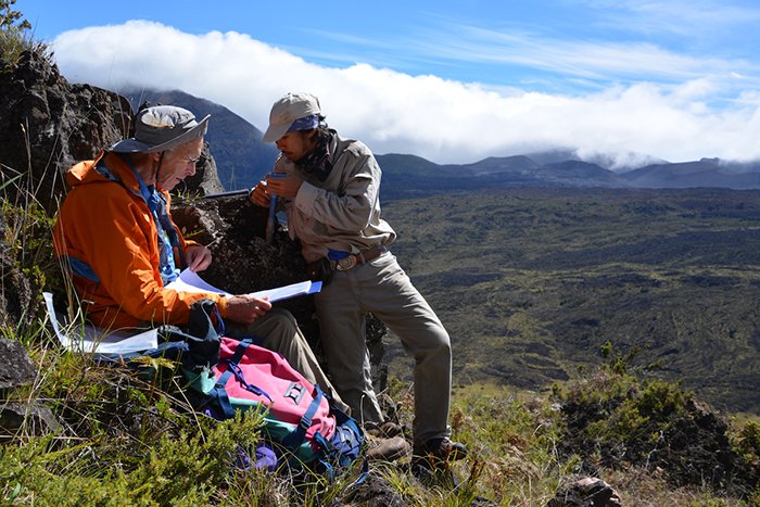 Researchers Rob Coe and Trevor Duarte at work in Haleakala Nationwide Park, Hawaii. (Brad Singer)
