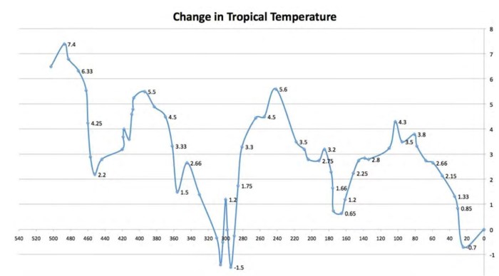 The utmost swing in temperature in Determine 1 is from 13 levels to 28 levels C. or a rise of 15 levels C. (27 levels F.) between 280 million years in the past and 250 million years in the past. That is from the depths of the Permo-Carboniferous icehouse to the height of the Triassic hothouse. Tropical temperatures change extra slowly than polar temperatures, evaluate Determine 1 to Determine 2.