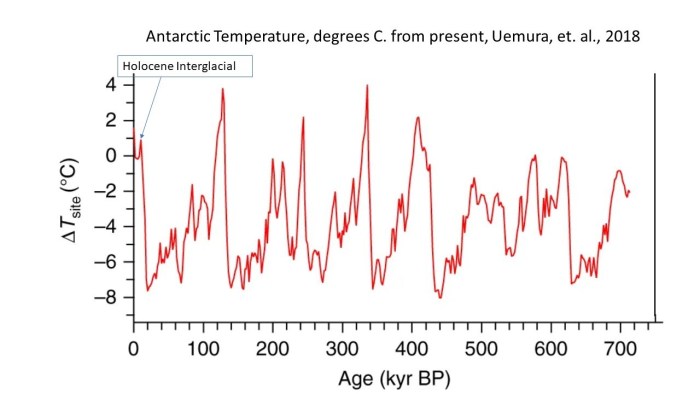 Ice ages are glacial durations, or durations of glacier advances, which are interrupted by durations of glacial retreat, referred to as interglacials. We’re presently dwelling in an ice age interglacial we name the Holocene, see Determine 7. The forces and mechanisms that trigger glacial advances and interglacials inside an ice age are understood moderately nicely and are nicely described by Javier, right here and right here. A plot of Antarctic temperatures, interpreted from ice cores, for the previous 750,000 years is proven in Determine 7. The interpretation was carried out by Ryu Uemura and colleagues (Uemura, Motoyama and Masson-Delmotte 2018).