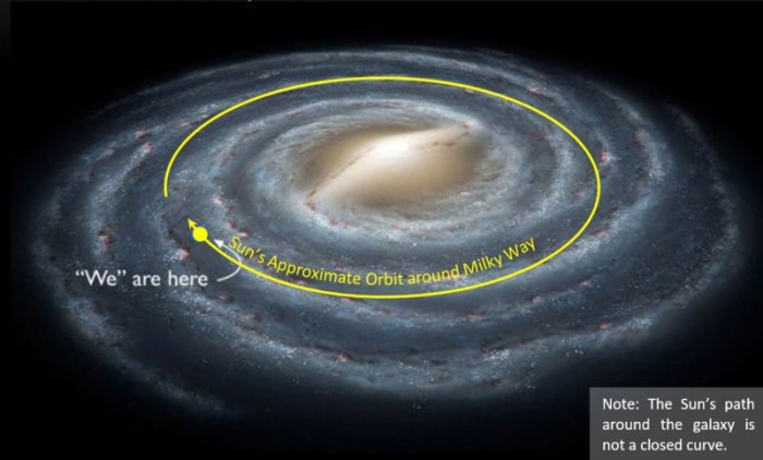 Determine 6. The Photo voltaic System orbits the middle of the Milky Means galaxy and passes via spiral arms roughly each 150 million years. At present the Photo voltaic System is on the fringe of the Sagittarius Arm of the galaxy. The Photo voltaic System additionally strikes up and down relative to the Galactic Airplane and its place up or down shouldn’t be identified very precisely. Supply: Physics Boards.