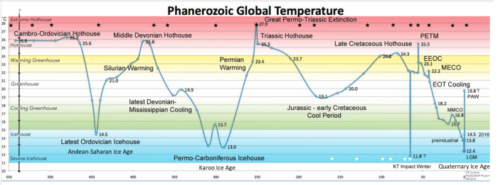 Determine 1. Christopher Scotese’s geological interpretation of Phanerozoic world temperatures in levels C. The vertical line on the appropriate aspect, labeled “PAW” is a projection of potential anthropogenic warming in response to a pessimistic IPCC local weather mannequin. In 2016 the precise world common floor temperature of the Earth was about 14.5 levels C. as marked on the plot, in 2019 the temperature is barely decrease at 14.35 levels in response to NASA GISS. The names of the main ice ages had been added by the creator. After (Scotese 2015)