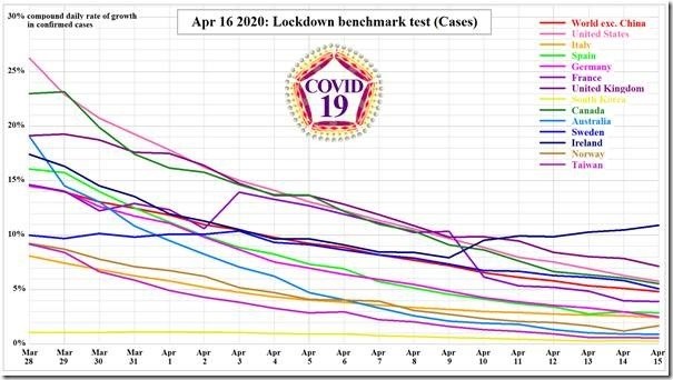 Fig. 1. Imply compound day by day progress charges in cumulative confirmed circumstances of COVID-19 for the world excluding China (crimson) and for a number of particular person nations averaged over the successive seven-day durations ending on all dates from March 28 to April 15, 2020. A hyperlink to the high-definition PowerPoint slides is on the finish of this posting.
