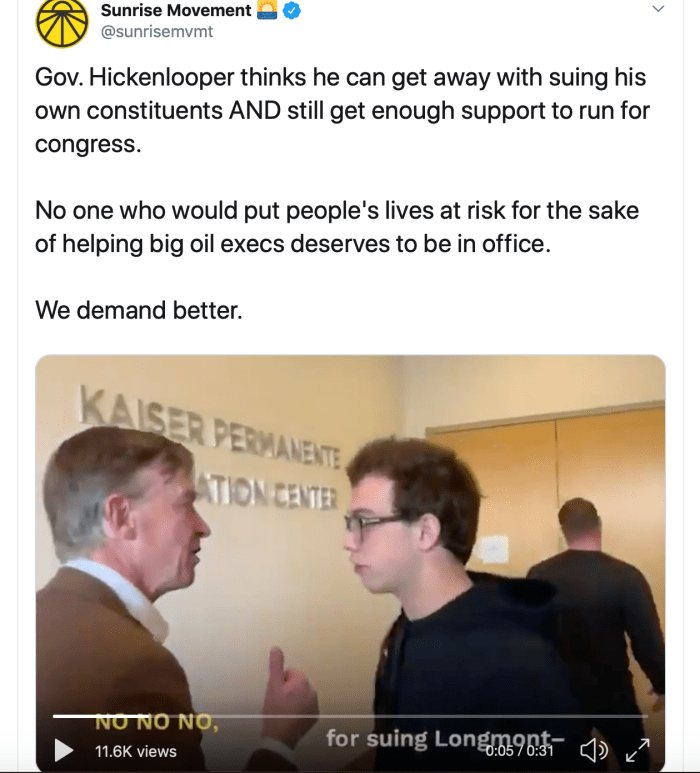 “Gov. Hickenlooper thinks he can get away with suing his personal constituents AND nonetheless get sufficient assist to run for congress,” the Dawn Motion famous in a Monday tweet. The group, a youth-led group that promoted the Inexperienced New Deal in 2019, criticized the Democrat for supposedly “serving to massive oil execs.”