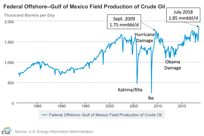 Hurricanes in 2005 (Katrina & Rita) and 2008 (Ike) inflicted in depth injury on Gulf of Mexico oil & fuel infrastructure, miserable manufacturing by about 250,000 bbl/d from 2006-2008. The Obama maladministration’s illegal drilling moratorium and “permitorium” in response to the Deepwater Horizon blowout and oil spill depressed manufacturing by about 500,000 bbl/d from 2011-2013.