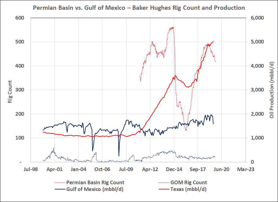 Determine 5. It takes about 400-500 drilling rigs to keep up and/or improve Permian Basin oil manufacturing. It solely takes 20-40 rigs to keep up and/or improve GOM oil manufacturing. The Permian Basin accounts for practically 2/three of Texas oil manufacturing. The rig counts are just for rigs drilling oil prospects/growth wells.
