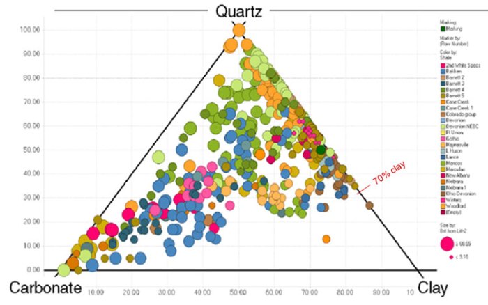 Halliburton Determine 1. ” Ternary diagram of all shales in database. The colour represents the person shale, and the scale of the bubble represents the brittleness as decided from XRD knowledge (computed by mineral composition).”