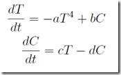 We are able to view this as a mannequin of water vapor suggestions the place; T is a floor temperature, C is a focus of water vapor, and a,b,c,d are constants. The set of equations is a system of first order differential equations, however non-linear. One can even view particular person phrases as second order if we differentiate the primary equation, and substitute into it the second. As an illustration, within the instance of temperature (T):