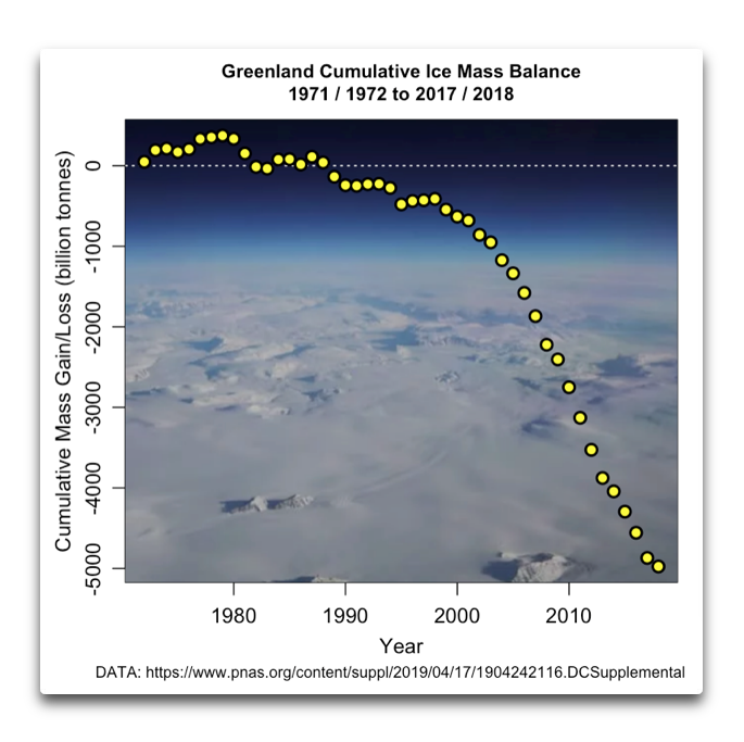 Let me shut with one other method to visualize the mass lack of the Greenland ice sheet utilizing two graphs. The primary graph exhibits the cumulative loss over the forty-six yr interval of the file. That is how it will generally be proven.
