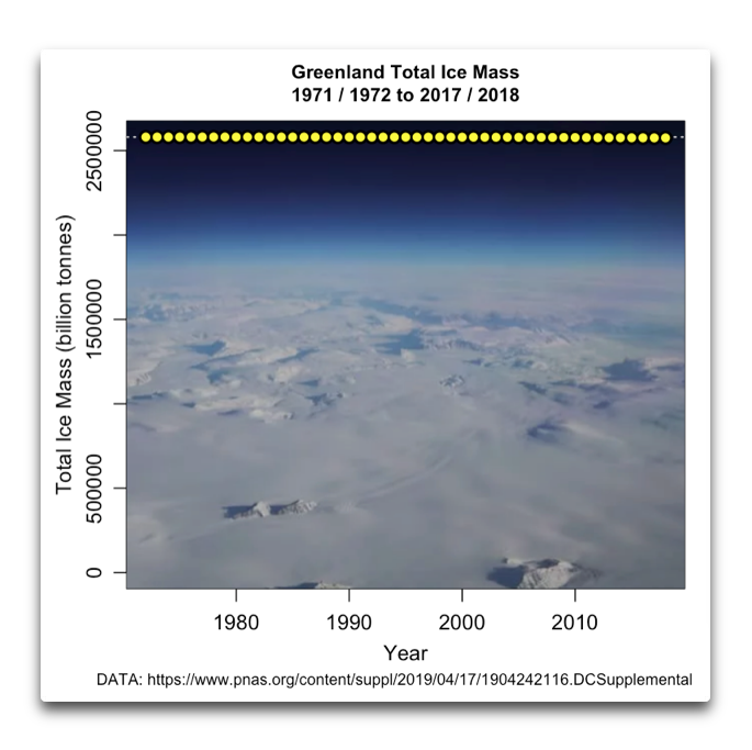 Against this, right here’s a extra sincere method to show the loss, by exhibiting not the annual or cumulative anomalies, however as an alternative exhibiting the adjustments within the complete mass of the Greenland ice sheet: