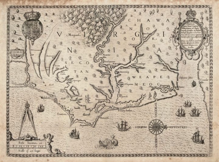 Map of the coast of Virginia and North Carolina, drawn 1585–1586. By Theodor de Bry – http://www.learnnc.org/lp/multimedia/6218, Public Area, Hyperlink
