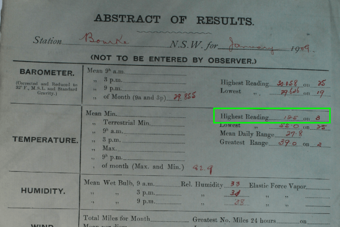 If we’re to be trustworthy to our historical past, then the file scorching day at Bourke of 51.7°C (125°F) should be re-instated, and additional the very popular 50.6°C (123°F) recorded for Brewarrina on the identical day should be entered into the official databases.