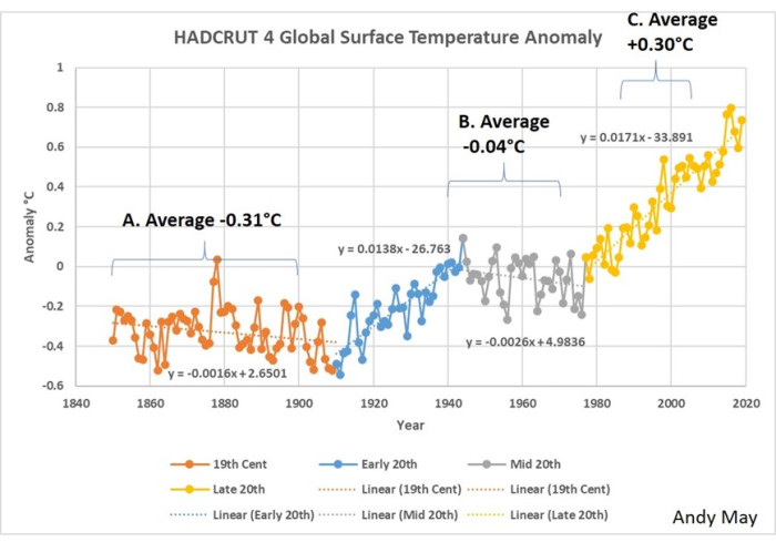 Determine four. The HadCRUT four floor temperature report. Intervals of warming and cooling are highlighted with coloration and traits. The early IPCC draft preindustrial interval is recognized as “A.” The common used to compute the fashionable warming baseline is recognized as “C.” The distinction, zero.61°C is the IPCC AR5 “trendy warming.” “B” is the preindustrial baseline advisable by Luning and Vahrenholt (Luning and Vahrenholt 2017).