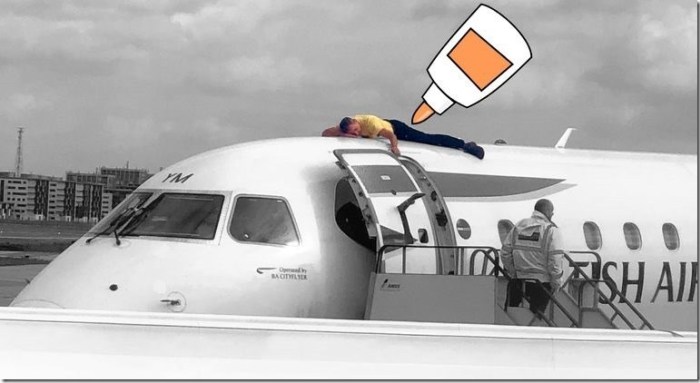 There’s heaps to unpack right here, like, say, how precisely visually impaired man was capable of climb on prime of a twin-engine jet airliner. Appears fairly exhausting! However we have been principally interested by the way you’d go about gluing your self to a aircraft. Since airport safety pulled Brown off the jet with relative ease, he actually couldn’t have tried very exhausting.