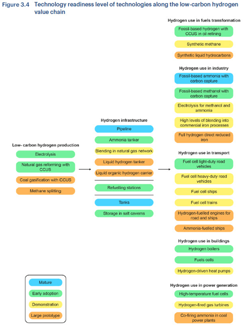 The report notes that “The worth chain for low-carbon hydrogen shouldn’t be fully developed at industrial scale in the present day. It includes many applied sciences which can be vital to provide, transport, retailer and eat low-carbon hydrogen, every of them at a distinct stage of maturity and dealing with particular technical challenges” as proven in Determine three.four Know-how Readiness Stage of applied sciences alongside the low-carbon hydrogen worth chain.