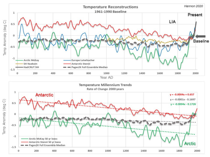 As anticipated, the millennial underlying pattern is transient with time. For instance, the MWP cooling descent into the LIA is quicker than the cooling over the previous 2000 years, backside graph in determine 2. The Arctic reveals a cooling of -1.1 deg C per 1000 years and the Antarctic is cooling at a fee of -Zero.6 deg C. Unbelievably, the Pages 2K world imply reveals a LIA cooling fee of solely -Zero.2 deg C per 1000 years that’s even slower than the Antarctic. The worldwide imply flattening impact reduces the temperature anomaly of heat intervals previous to the LIA and doesn’t correctly protect the LIA cooling pattern.