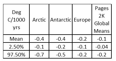 Curiously, all the worldwide means are practically flat or present a refined cooling pattern. The worldwide imply cooling pattern is extra aligned with the NH Europe temperature reconstruction. Notice the 97.5% world imply cooling of -Zero.2 deg C per 1000 years remains to be flatter than each the Arctic and Antarctic imply cooling pattern of -Zero.four deg C per 1000 years. Additionally, the worldwide imply low 2.5% vary of -Zero.04 deg C per 1000 years is way flatter than the low vary of any regional reconstruction.