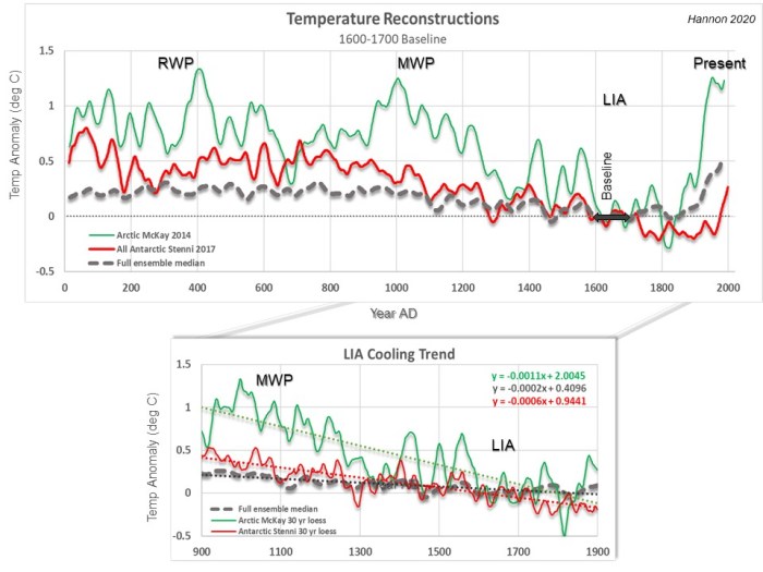 As mentioned in my earlier put up, I want utilizing the LIA 1600-1700 AD as a baseline slightly than the 1961-1990 baseline for prolonged temperature reconstructions. Utilizing the LIA baseline maintains convergence of temperatures through the chilly LIA and temperature divergences between the Arctic and Antarctic throughout hotter intervals. It permits the Medieval Heat Interval (MWP), Roman Heat Interval (RWP) and LIA local weather occasions to be prominently seen on the Arctic information proven in Determine 2. Moreover, these Polar areas are positioned in a correct local weather context with the Antarctic exhibiting colder temperature anomalies than the Arctic.