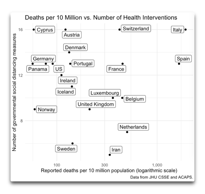 Nonetheless, being a graphically minded type of particular person, I then made a scatterplot of the variety of distinct sorts of restrictions a rustic has imposed versus the variety of deaths per ten million in that nation. Determine 2 reveals the end result: