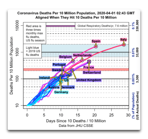 As you possibly can see, there may be little or no distinction within the demise charges between the varied nations, although all of them have differing ranges of well being interventions to attempt to forestall the unfold. They’re all following the identical trajectory.