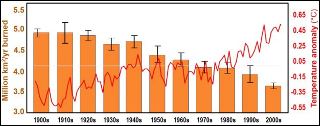 Inserting the above chart into the total historical past of the information obtainable (Determine 23) reveals fairly a special story. The true and inconvenient revelation is that the realm burned has additionally dramatically declined from greater than 50 million acres to the present 6 to 10 million acres per 12 months.